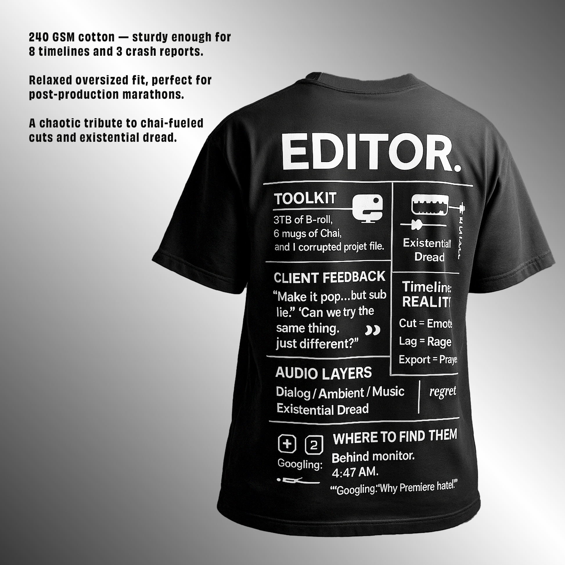 A visual essay of the layers, cuts, and chaos that define the editor’s life — with humor, honesty, and way too many render errors.Designed for those who don’t just edit.